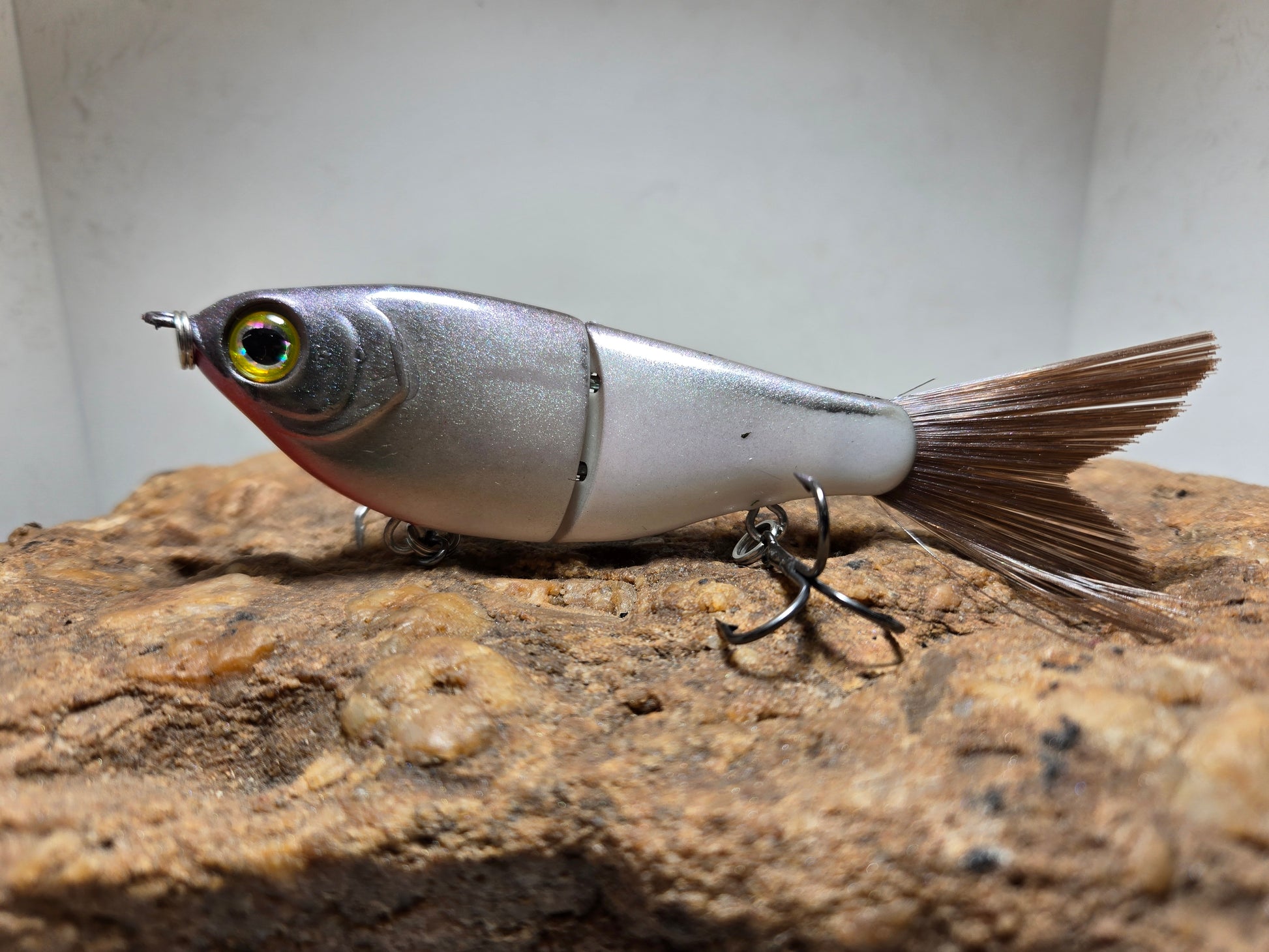 A custom painted Glide bait by us Hand crafted and ready to do battle with big bass. Our version of Mystic Shad its a hammer.